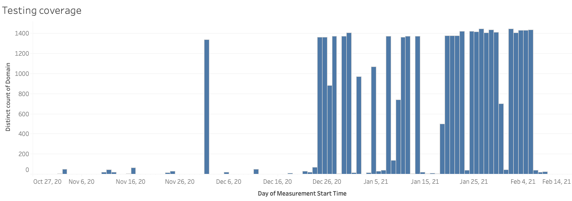 But starting from 24th December 2020, OONI Probe testing coverage in Azerbaijan increased significantly. The following chart illustrates that most domains from the testing lists were tested at least once between December 2020 to February 2021, while in many cases, around 1,400 domains were tested per day in Azerbaijan.
