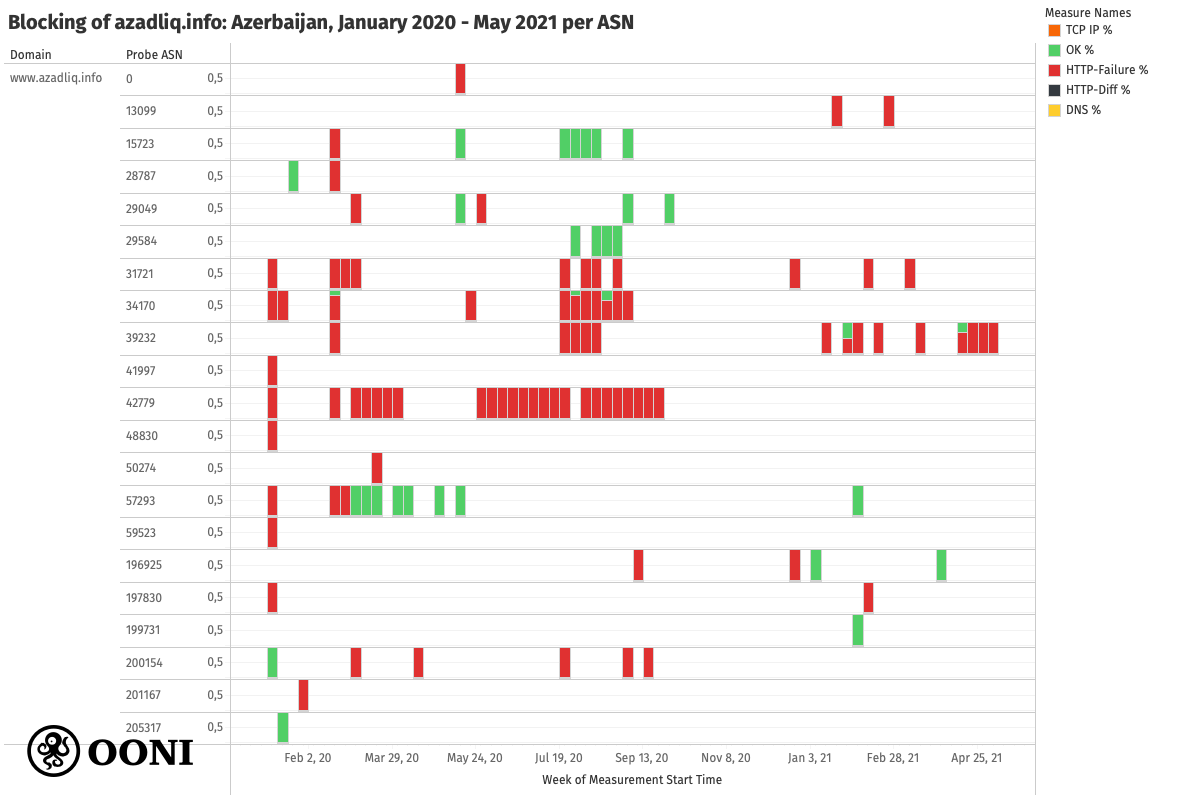 The above chart aggregates measurement findings (per domain) from many different networks in Azerbaijan (as annotated in the chart, where the largest dots correspond to measurements collected from 9 local networks). The reason why we see different measurement results (such as “OK” and “HTTP failure”) for the same URL on the same dates is because those results were collected from different networks. This therefore suggests that media website blocking varies from network to network in Azerbaijan. This is further evident through a per ASN analysis of measurements.