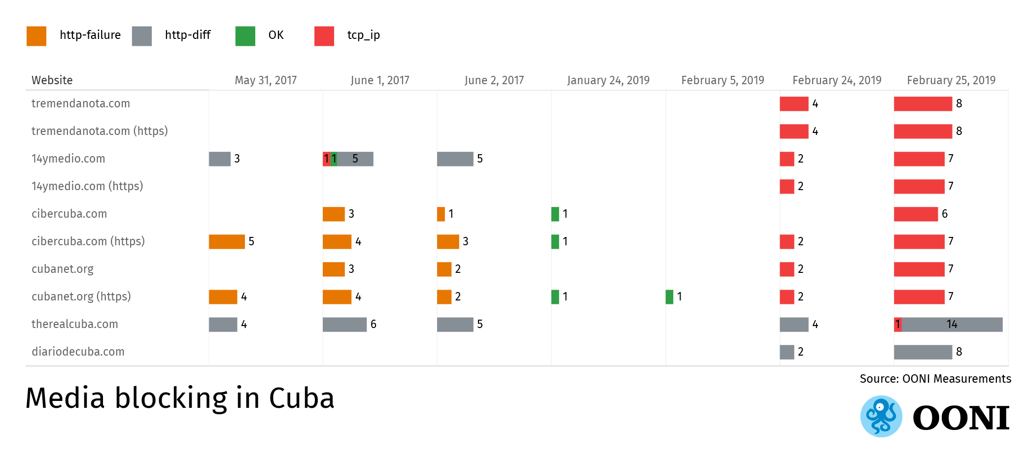 Source: Open Observatory of Network Interference (OONI) measurements: Cuba, https://explorer.ooni.io/country/CU